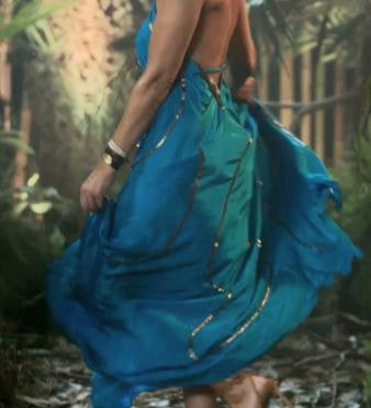 VESTIDO LARGO AZUL CON ESPALDA AL AIRE Y BORDADOS DORADOS HECHO A MANO