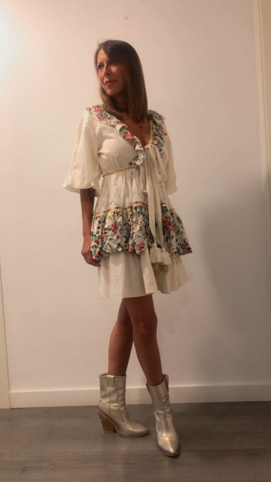 VESTIDO CORTO RALLAS GOLDEN CON ESTAMPADO Y BORDADO A MANO 100% COTTON VERDE