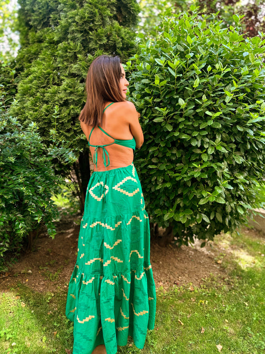 VESTIDO LARGO VERDE CON ESPALDA AL AIRE Y BORDADOS DORADOS